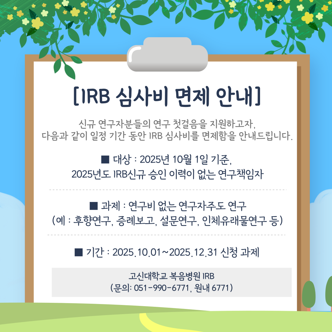 IRB 로그인 회원가입 IRB 소개IRB란eIRB 소개심사 절차심사비위원명단담당자 연락처연구자조회신청 및 보고제출서류안내종사자교육안내의뢰자조회연구자에게의뢰IRB직접보고관련자료관련법규관련규정IRB양식함기타CTC담당자 연락처도움말공지사항F A Q오시는 길 IRB INTRODUCTION 고신대학교 복음병원 IRB는 헬싱키선언에 근거한 윤리규정과 국제임상시험통일안, 임상시험관리기준 그리고 생명윤리 및 안전에 관한 법률을 준수하여 연구대상자의 권리·복지·안전을 최우선의 가치로 여기며, 본원의 연구역량을 최대화하기 위하여 체계적이며 효율적으로 심의가 이루어질 수 있도록 최선을 다하고 있습니다.고신대학교 복음병원 IRB는 2021년 보건복지부「기관생명윤리위원회 평가·인증」을 획득하였습니다. (인증 유효기간 3년, 2022.03.11~2025.03.10) 업무별 담당자 안내 IRB 소식 공지 심의/행사 IRB 심사비 면제 안내 (~2025.12.31) IRB SOP 개정안내 [시행일 : 2025년 7월 1일] ★ 2025년 정규/신속심의 개최일정 및 접수마감일 건강한 사람 대상 임상시험의 중복 참여 확인 관련 안내 체외진단의료기기 임상적 성능시험 기관의 관리기준 안내 IRB 신속심의 [2025년 12월 - 1] [2025 -12월 정규심의] IRB 신속심의 [2025년 11월 - 4] IRB 신속심의 [2025년 11월 - 3] IRB 신속심의 [2025년 11월 - 2] 일정안내 2023년 2024년 2025년 2026년 1월 2월 3월 4월 5월 6월 7월 8월 9월 10월 11월 12월 심의 행사 심의/행사 전화 IRB심의 관련 051-990-6771 IRB심사비 051-990-6771 연구비/계약서/문서보관 051-990-6770 EMR/ID발급/모니터링 051-990-6770 임상시험센터 051-990-6770 임상시험약국 051-990-6029 팩스 051-990-3075 이메일 IRB심의 관련 kosinirb@kosinmed.or.kr IRB심사비 kosinirb2@kosinmed.or.kr 연구비/계약서/문서보관 kosinctc@kosinmed.or.kr EMR/ID발급/모니터링 kosinctc@kosinmed.or.kr 임상시험센터 kosinctc@kosinmed.or.kr 임상시험약국 pharmcrp@gmail.com R-BAY 공지 바로가기 R-BAY 시스템 [정기/비정기/긴급] 작업 안내(수정 및 정기작업추가) R-BAY 시스템 신규 사용자 이용 안내 서비스 가입 및 문의 [필독] 중요 업데이트 안내 (답변보고) 동의서인증 시스템 QR코드 업데이트 안내 R-BAY 교육 바로가기 로그인 후 조회가 가능합니다.