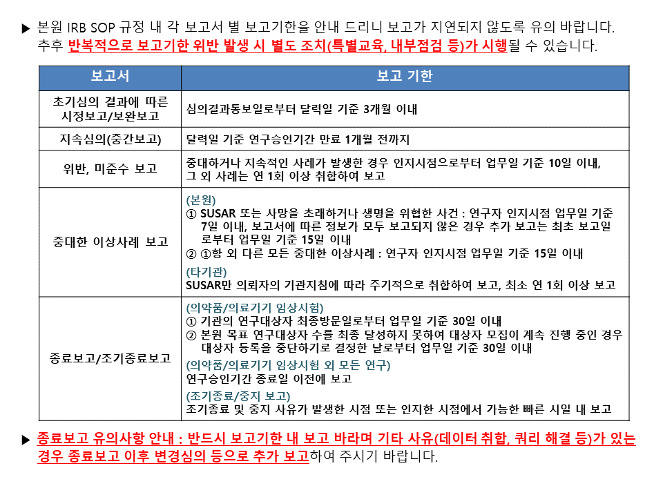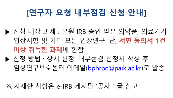 IRB 로그인 회원가입 인제대학교 부산백병원 연구대상자의 권리 · 안전 · 복지를 보호하는 IRB Institutional Review Board IRB INTRODUCTION 부산백병원 의생명연구윤리심의위원회(IRB)는 1994년 2월 임상연구소위원회를 시작으로 연구대상자의 권리ㆍ안전ㆍ복지를 위하여 연구계획의 과학적 신뢰성과 윤리성을 검토하고자 독립적으로 설치된 상설위원회이며, ICH-GCP, 약사법, 의료기기법, 생명윤리 및 안전에 관한 법률 등 국내외 관련 법 및 지침을 준수합니다. 업무별 담당자 안내 IRB 소식 공지 심의/행사 인제대학교 부산백병원 2025년 IRB 정규심의 일정 안내 과제 신청방법 및 필수제출문서 안내(리뉴얼 시스템) 심의비 안내(2024.03.01변경) IRB/HRPC 공식명칭 안내 및 관련부서 연락처(2025.08.20 업데이트) 이력서/교육등록 및 연구관련 교육이수 방법 조회된 게시글이 없습니다. 일정안내 2023년 2024년 2025년 2026년 1월 2월 3월 4월 5월 6월 7월 8월 9월 10월 11월 12월 심의 행사 심의/행사 전화 IRB 심의 관련 051-890-8954, 5707 심사비/연구비 051-890-5774~5 계약서/문서보관 051-890-5775 임상시험센터 051-890-5710 임상시험약국 051-890-8974 팩스 IRB 051-890-5708 연구비/계약 051-891-5746 이메일 IRB 심의 관련 bpirb@paik.ac.kr 심사비/연구비 pmh0503@paik.ac.kr 계약서/문서보관 jeeyoungkim@paik.ac.kr 임상시험센터 hyjung@paik.ac.kr 임상시험약국 ctcpharm@paik.ac.kr R-BAY 공지 바로가기 OpenPDF 라이브러리 사용 안내 [필독] 중요 업데이트 안내 (답변보고) R-BAY 시스템 [정기/비정기/긴급] 작업 안내(수정 및 정기작업추가) R-BAY 교육 바로가기 로그인 후 조회가 가능합니다.