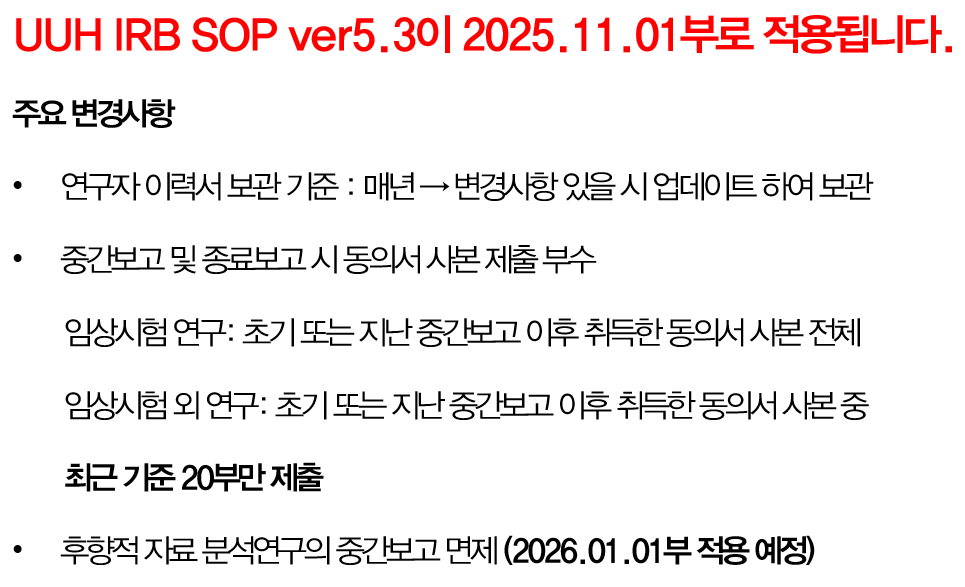 IRB 로그인 회원가입 IRBIRB 소개IRB 위원명단오시는 길심사심사일정심사 흐름도심사비양식함게시판관련법규기타FAQ 임상시험센터홈페이지 IRB INTRODUCTION 울산대학교병원 임상연구심의위원회(IRB)는 기관 내에 독립적으로 설치된 상설위원회로서, 임상시험대상자의 존엄성과 권리를 보호하며 안전 및 복지를 증진시키고, 과학적 연구의 신뢰성을 높이기 위해 연구의 윤리성, 효율성 및 안전성을 검토합니다. 업무별 담당자 안내 IRB 소식 공지 심의/행사 2.신규 이외 유형 별 심의 제출서류 1.신규 연구과제 유형 별 심의 제출서류 심사비 관련 서류모음(계산서발급요청서, 통장사본 등) 항암 주사약 조제 관련 신규과제 제출 시 안내사항 IRB 심의 신청 시 자주 지적되는 사항 및 유의사항 안내 2025년도 IRB 정식심사 일정 연구자가 알아야 할 규정 IRB SOP Ver3.0 일정안내 2023년 2024년 2025년 2026년 1월 2월 3월 4월 5월 6월 7월 8월 9월 10월 11월 12월 심의 행사 심의/행사 전화 052-250-7010052-250-7012 팩스 052-250-8098 이메일 0716782@uuh.ulsan.kr0733371@uuh.ulsan.kr R-BAY 공지 바로가기 OpenPDF 라이브러리 사용 안내 [필독] 중요 업데이트 안내 (답변보고) R-BAY 시스템 [정기/비정기/긴급] 작업 안내(수정 및 정기작업추가) R-BAY 교육 바로가기 로그인 후 조회가 가능합니다. 임상시험센터 홈페이지https://www.uuh.ulsan.kr/uuhctc/