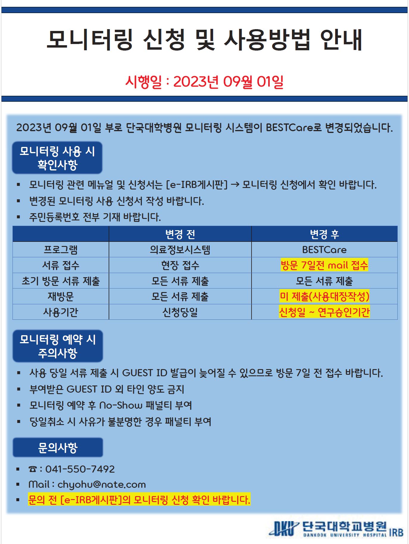 IRB 로그인 회원가입 심의안내심의신청심의절차심사비공지사항공지사항심의일정교육안내자료실관련법규양식 IRB INTRODUCTION 단국대학교병원 IRB는단국대학교병원에서 시행되는임상연구가 한국 의약품 임상시험 관리기준(KGCP)과 국제기준(ICH)에 따라 과학적이고윤리적으로 이루어질 수 있도록함으로써 피험자와 연구자를보호하고 연구결과의 신뢰성을 확립할 수 있도록 하겠습니다. 업무별 담당자 업무별 담당자 정보를안내해 드립니다. 바로가기 IRB 소식 공지 심의/행사 [심의일정] 2026년 IRB 정규심의 일정표 [필독] 임상시험대상자 모집 공고 관련 유의사항-식약처 가이드라인 [필독] 원내 약제관리비 변경 공지 [필독] 심사비, 문서보관비 안내_세금계산서신청 [체외진단의료기기 교육 안내] [생명윤리교육] 생명윤리교육 이수 안내 [심의일정] 2026년 1월 정규심의 [심의일정] 2025년 12월 정규심의 [심의일정] 2025년 11월 정규심의 [심의일정] 2025년 10월 정규심의 일정안내 2023년 2024년 2025년 2026년 2027년 1월 2월 3월 4월 5월 6월 7월 8월 9월 10월 11월 12월 심의 행사 심의/행사 전화 041-550-7492 : IRB041-550-7498 : IRB교육, IRB회원관리041-550-7493 : 계약서, IRB회원관리041-550-7495 : IRB심사비, 연구비, 세금계산서041-550-7494 : QA 팩스 041-550-7490 이메일 chyohu@nate.com : IRBjsa2225@dkuh.co.kr : IRB 교육, IRB 회원관리poipoi8229@dkuh.co.kr : 계약서, IRB 회원관리chon0524@dkuh.co.kr : IRB 심사비, 연구비, 세금계산서kbe@dkuh.co.kr : QA R-BAY 공지 바로가기 R-BAY 시스템 [정기/비정기/긴급] 작업 안내(수정 및 정기작업추가) R-BAY 시스템 신규 사용자 이용 안내 서비스 가입 및 문의 R-BAY(e-IRB) 영문 번역 서비스 12/23(화) 오픈 안내 [필독] 중요 업데이트 안내 (답변보고) R-BAY 교육 바로가기 로그인 후 조회가 가능합니다.