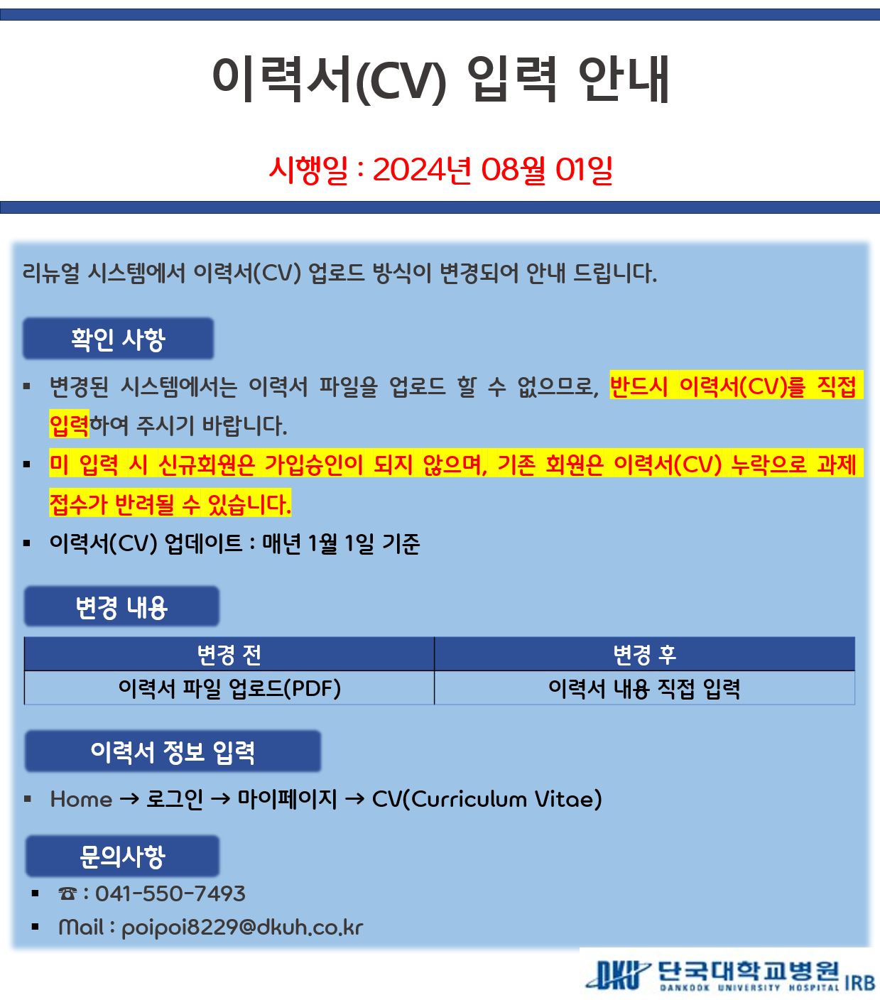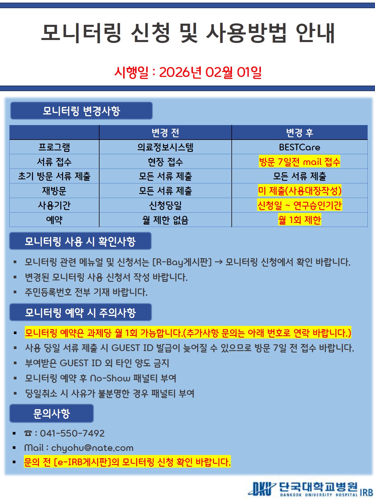 IRB 로그인 회원가입 심의안내심의신청심의절차심사비공지사항공지사항심의일정교육안내자료실관련법규양식 IRB INTRODUCTION 단국대학교병원 IRB는단국대학교병원에서 시행되는임상연구가 한국 의약품 임상시험 관리기준(KGCP)과 국제기준(ICH)에 따라 과학적이고윤리적으로 이루어질 수 있도록함으로써 피험자와 연구자를보호하고 연구결과의 신뢰성을 확립할 수 있도록 하겠습니다. 업무별 담당자 업무별 담당자 정보를안내해 드립니다. 바로가기 IRB 소식 공지 심의/행사 [심의일정] 2026년 IRB 정규심의 일정표 [필독] 임상시험대상자 모집 공고 관련 유의사항-식약처 가이드라인 [필독] 원내 약제관리비 변경 공지 [필독] 심사비, 문서보관비 안내_세금계산서신청 [체외진단의료기기 교육 안내] [생명윤리교육] 생명윤리교육 이수 안내 [심의일정] 2026년 2월 정규심의 [심의일정] 2026년 1월 정규심의 [심의일정] 2025년 12월 정규심의 [심의일정] 2025년 11월 정규심의 일정안내 2023년 2024년 2025년 2026년 2027년 1월 2월 3월 4월 5월 6월 7월 8월 9월 10월 11월 12월 심의 행사 심의/행사 전화 041-550-7492 : IRB041-550-7498 : IRB교육, IRB회원관리041-550-7493 : 계약서, IRB회원관리041-550-7495 : IRB심사비, 연구비, 세금계산서041-550-7494 : QA 팩스 041-550-7490 이메일 chyohu@nate.com : IRBjsa2225@dkuh.co.kr : IRB 교육, IRB 회원관리poipoi8229@dkuh.co.kr : 계약서, IRB 회원관리chon0524@dkuh.co.kr : IRB 심사비, 연구비, 세금계산서kbe@dkuh.co.kr : QA R-BAY 공지 바로가기 R-BAY 시스템 [정기/비정기/긴급] 작업 안내(수정 및 정기작업추가) R-BAY 시스템 신규 사용자 이용 안내 서비스 가입 및 문의 R-BAY(e-IRB) 영문 번역 서비스 12/23(화) 오픈 안내 [필독] 중요 업데이트 안내 (답변보고) R-BAY 교육 바로가기 로그인 후 조회가 가능합니다.