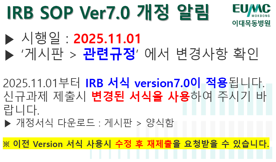 IRB 로그인 회원가입 IRB 소개IRB 소개조직도위원명단IRB 심의 안내연구자의 자격심의대상심의일정심의 흐름도심의비관련자료관련법규관련규정양식함관련사이트공지사항공지사항심의일정 FAQ IRB INTRODUCTION 이대목동병원 기관생명윤리위원회(IRB)는 헬싱키 선언에 근거한 윤리규정 및 임상시험관리기준(GCP), 국제임상시험통일안(ICH-GCP), 생명윤리 및 안전에 관한 법률 등 관련 규정을 준수하며, 임상시험계획서를 윤리적, 과학적 측면에서 심의함으로써 시험대상자의 권리·안전·복지를 보호하기 위해 독립적으로 설치된 기관위원회이다. 업무별 담당자 업무별 담당자 정보를안내해 드립니다. 바로가기 IRB 소식 공지 심의/행사 ■ IRB 심의 일정안내_2025년 (2024.12.09 업데이트) ■ 신규과제 심의 신청안내(2025.11.01.변경) ■ 심의면제 신청안내(2025.11.01. 부) ■ 변경계획서 심의신청(2025.11.01. 부) ■ 예상하지 못한 문제보고 심의신청(2025.11.01. 부) 2025년 신규과제 정식심의 일정 안내(12/25, 목) - 공휴일 2025년 신규과제 정식심의 일정 안내(12/16, 화) 2025년 신규과제 정식심의 일정 안내(12/9, 화) 2025년 신규과제 정식심의 일정 안내(11/27, 목) 2025년 신규과제 정식심의 일정 안내(11/18, 화) 일정안내 2023년 2024년 2025년 2026년 1월 2월 3월 4월 5월 6월 7월 8월 9월 10월 11월 12월 심의 행사 심의/행사 전화 02-2650-2019 : 신규과제, 심의비, 문서이관 02-2650-5872 : 변경,중간,종료/결과,문제보고 02-2650-2937 : 임상시험종사자 교육 문의 팩스 02-2650-2936 이메일 irb-mok@eumc.ac.kr R-BAY 공지 바로가기 R-BAY 시스템 [정기/비정기/긴급] 작업 안내(수정 및 정기작업추가) R-BAY 시스템 신규 사용자 이용 안내 서비스 가입 및 문의 [필독] 중요 업데이트 안내 (답변보고) 동의서인증 시스템 QR코드 업데이트 안내 R-BAY 교육 바로가기 로그인 후 조회가 가능합니다.