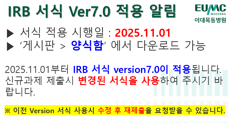 IRB 로그인 회원가입 IRB 소개IRB 소개조직도위원명단IRB 심의 안내연구자의 자격심의대상심의일정심의 흐름도심의비관련자료관련법규관련규정양식함관련사이트공지사항공지사항심의일정 FAQ IRB INTRODUCTION 이대목동병원 기관생명윤리위원회(IRB)는 헬싱키 선언에 근거한 윤리규정 및 임상시험관리기준(GCP), 국제임상시험통일안(ICH-GCP), 생명윤리 및 안전에 관한 법률 등 관련 규정을 준수하며, 임상시험계획서를 윤리적, 과학적 측면에서 심의함으로써 시험대상자의 권리·안전·복지를 보호하기 위해 독립적으로 설치된 기관위원회이다. 업무별 담당자 업무별 담당자 정보를안내해 드립니다. 바로가기 IRB 소식 공지 심의/행사 ■ [중요] 데이터심의위원회 심의 진행 안내(2026.03.04 개정) - ★ 동의면제 과제 수행 연구자 필독 ★ 문의 : 02-6986-1869 ■ 담당자 연락처 안내_신규과제(내선 2019), 신규 외(변경,중간,종료,결과,문제 : 내선 5872), 연구계약(내선 2816), 교육검증(내선 2937) ■ IRB 심의 일정안내_2026년 (2025.12.04 업데이트) ■ 신규과제 심의 신청안내(2025.11.01.변경) ★신규과제★ ■ 심의면제 신청안내(2025.11.01. 부) 2026년 신규과제 정식심의 일정 안내(12 / 24, 목) 2026년 신규과제 정식심의 일정 안내(12/15, 화) 2026년 신규과제 정식심의 일정 안내(12/8, 화) 2026년 신규과제 정식심의 일정 안내(11 / 26, 목) 2026년 신규과제 정식심의 일정 안내(11/17, 화) 일정안내 2023년 2024년 2025년 2026년 2027년 1월 2월 3월 4월 5월 6월 7월 8월 9월 10월 11월 12월 심의 행사 심의/행사 전화 02-2650-2019 : 신규과제, 심의비, 문서이관 02-2650-5872 : 변경,중간,종료/결과,문제보고 02-2650-2937 : 임상시험종사자 교육 문의 팩스 02-2650-2936 이메일 irb-mok@eumc.ac.kr R-BAY 공지 바로가기 R-BAY 시스템 [정기/비정기/긴급] 작업 안내(수정 및 정기작업추가) R-BAY 시스템 신규 사용자 이용 안내 서비스 가입 및 문의 R-BAY(e-IRB) 영문 번역 서비스 12/23(화) 오픈 안내 [필독] 중요 업데이트 안내 (답변보고) R-BAY 교육 바로가기 로그인 후 조회가 가능합니다.