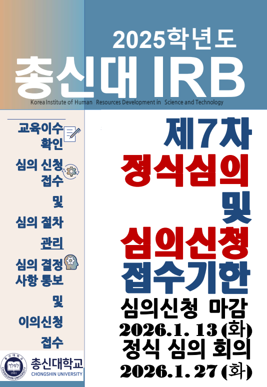 IRB 로그인 회원가입 FAQFAQ양식함양식함e-IRB 사용법STSTEM 사용법 IRB INTRODUCTION 총신대학교 생명윤리위원회(IRB)는 「생명윤리 및 안전에 관한 법률」에 따라 인간과 인체유래물등을 대상으로 하는 연구에서 윤리적·과학적 타당성을심의하고 이를 지속적으로 확인함으로써 연구에 참여하는 연구대상자의 권리·안전·복지를 보호하기 위해 학내에 구성된 독립적인 심의기구입니다. 업무별 담당자 안내 IRB 소식 공지 심의/행사 2025학년도 제7차 정식심의 및 심의신청 IRB 심사 기준 _ '심사용 연구계획서 점검표' 및 '대상자 동의서·설명문' 제공 [공지 업데이트 준비 중] 연구책임자(연구담당자)를 위한 심의신청 및 관련 절차 [총신대 IRB] 심의신청을 위한 매뉴얼 심의 평가 주요 고려 사항: 연구대상자 보호 안내 (제1회 정식심의 기준) 2025학년도 제6차 정식심의 및 심의신청 2025학년도 제2차 정식심의(심의신청 마감)일정 안내 2025학년도 제5차 정식심의 및 심의신청 2025학년도 제4차 정식심의 및 심의신청 2025학년도 제3차 정식심의 및 심의신청 일정안내 2023년 2024년 2025년 2026년 1월 2월 3월 4월 5월 6월 7월 8월 9월 10월 11월 12월 심의 행사 심의/행사 전화 02-3479-0628 팩스 이메일 csuirb@csu.ac.kr R-BAY 공지 바로가기 R-BAY 시스템 [정기/비정기/긴급] 작업 안내(수정 및 정기작업추가) R-BAY 시스템 신규 사용자 이용 안내 서비스 가입 및 문의 [필독] 중요 업데이트 안내 (답변보고) 동의서인증 시스템 QR코드 업데이트 안내 R-BAY 교육 바로가기 로그인 후 조회가 가능합니다.