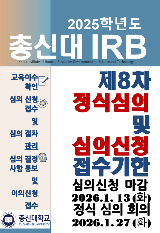 IRB 로그인 회원가입 FAQFAQ양식함양식함e-IRB 사용법STSTEM 사용법 IRB INTRODUCTION 총신대학교 생명윤리위원회(IRB)는 「생명윤리 및 안전에 관한 법률」에 따라 인간과 인체유래물등을 대상으로 하는 연구에서 윤리적·과학적 타당성을심의하고 이를 지속적으로 확인함으로써 연구에 참여하는 연구대상자의 권리·안전·복지를 보호하기 위해 학내에 구성된 독립적인 심의기구입니다. 업무별 담당자 안내 IRB 소식 공지 심의/행사 2025학년도 제7차 정식심의 및 심의신청 IRB 심사 기준 _ '심사용 연구계획서 점검표' 및 '대상자 동의서·설명문' 제공 [공지 업데이트 준비 중] 연구책임자(연구담당자)를 위한 심의신청 및 관련 절차 [총신대 IRB] 심의신청을 위한 매뉴얼 심의 평가 주요 고려 사항: 연구대상자 보호 안내 (제1회 정식심의 기준) 2025학년도 제6차 정식심의 및 심의신청 2025학년도 제2차 정식심의(심의신청 마감)일정 안내 2025학년도 제8차 정식심의 및 심의신청 2025학년도 제5차 정식심의 및 심의신청 2025학년도 제4차 정식심의 및 심의신청 일정안내 2023년 2024년 2025년 2026년 2027년 1월 2월 3월 4월 5월 6월 7월 8월 9월 10월 11월 12월 심의 행사 심의/행사 전화 02-3479-0628 팩스 이메일 csuirb@csu.ac.kr R-BAY 공지 바로가기 R-BAY 시스템 [정기/비정기/긴급] 작업 안내(수정 및 정기작업추가) R-BAY 시스템 신규 사용자 이용 안내 서비스 가입 및 문의 R-BAY(e-IRB) 영문 번역 서비스 12/23(화) 오픈 안내 [필독] 중요 업데이트 안내 (답변보고) R-BAY 교육 바로가기 로그인 후 조회가 가능합니다.
