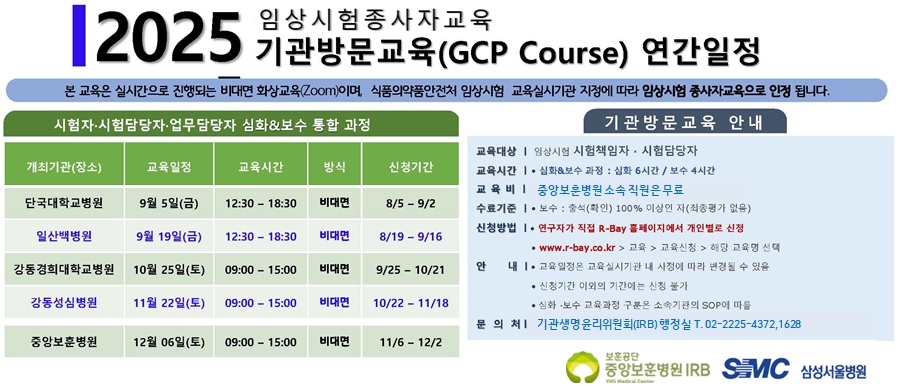 IRB 로그인 회원가입 IRB INTRODUCTION 중앙보훈병원 기관생명윤리위원회(Institutional Review Board)는 헬싱키 선언에 근거한 윤리규정 및 국제임상시험통일안(ICH), 임상시험관리기준(GCP), 생명윤리 및 안전에 관한 법률 등 관련 규정을 준수하며, 임상연구에 참여하는 연구대상자의 권리·안전·복지를 도모하고 연구결과의 신뢰성을 확립할 수 있도록 연구계획을 심의하기 위해 설치되었습니다. 업무별 담당자 안내 IRB 소식 공지 심의/행사 모니터링룸 예약 및 모니터의 EMR ID발급 공지건 심사비 입금절차 안내 공지건 2025년도 임상(임상시험) 연구비 입금 및 연구계약 업무 관련 사항 안내건 2025년 체외진단 임상적 성능시험 종사자 교육 안내_시험책임자 및 시험담당자 보훈의학연구소 IRB심의시 서류 제출 공지건 2025년 제12차 정규심의 일정 안내 공지 2025년 제11차 정규심의 일정 안내 공지 2025년 제10차 정규심의 일정 안내 공지 2025년 제9차 정규심의 일정 안내 공지 2025년 제8차 정규심의 일정 안내 공지 일정안내 2023년 2024년 2025년 2026년 1월 2월 3월 4월 5월 6월 7월 8월 9월 10월 11월 12월 심의 행사 심의/행사 전화 02-2225-4372 IRB행정총괄02-2225-1628 심의비 02-2225-3922 연구계약 02-2225-1840 연구비 팩스 02-2225-1325 IRB 행정실02-2225-3950 연구계약 02-2225-3950 연구비 이메일 sjy1004@bohun.or.kr IRB행정총괄luckygirl797@bohun.or.kr 심의비 kimkhshep@bohun.or.kr 연구계약 wlthd1721@bohun.or.kr 연구비 R-BAY 공지 바로가기 OpenPDF 라이브러리 사용 안내 [필독] 중요 업데이트 안내 (답변보고) R-BAY 시스템 [정기/비정기/긴급] 작업 안내(수정 및 정기작업추가) R-BAY 교육 바로가기 로그인 후 조회가 가능합니다.