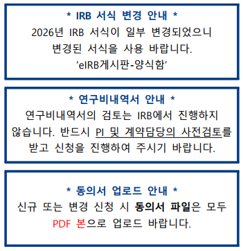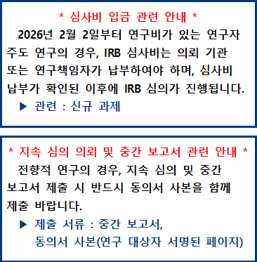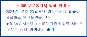 IRB 로그인 회원가입 소개소개IRB위원명단위치공지사항공지심의심의과정심의보고기한심의일정심의료안내제출서류안내관련자료관련법규IRB서식 IRB INTRODUCTION 제주대학교병원 의학연구윤리심의위원회(IRB)는 연구계획서, 변경계획서, 피험자 서면동의 및 기타 필요한 사항들을 심의하고 지속적으로 확인함으로써 임상시험 연구와 관련된 피험자의 권익보호 및 안전을 위하여 연구 기관 내에 독립적으로 설치된 상설위원회다. 업무별 담당자 안내 IRB 소식 공지 심의/행사 2026년 제5차 정규 심의 일정 안내 2026년 제 4 차 정규 심의 일정 안내 2026년 제 3 차 정규 심의 일정 안내 2026년 제 2 차 정규 심의 일정 안내 [교육] 2026년 의약품, 의료기기 임상시험 종사자 교육 안내 [심의]2025년 3차 정규심의 일정 안내 [심의]2025년 2차 정규심의 일정 안내 [심의]2025년 1차 정규심의 일정 안내 [심의]2024년 12차 정규심의 일정 안내 [심의]2024년 11차 정규심의 일정 안내 일정안내 2023년 2024년 2025년 2026년 2027년 1월 2월 3월 4월 5월 6월 7월 8월 9월 10월 11월 12월 심의 행사 심의/행사 전화 064-717-1503 IRB 관련 팩스 064-717-1889 이메일 irb1503@jejunuh.co.kr R-BAY 공지 바로가기 R-BAY 시스템 [정기/비정기/긴급] 작업 안내(수정 및 정기작업추가) R-BAY 시스템 신규 사용자 이용 안내 서비스 가입 및 문의 R-BAY(e-IRB) 영문 번역 서비스 12/23(화) 오픈 안내 [필독] 중요 업데이트 안내 (답변보고) R-BAY 교육 바로가기 로그인 후 조회가 가능합니다. 2026년 정규 심의 일정 계획
