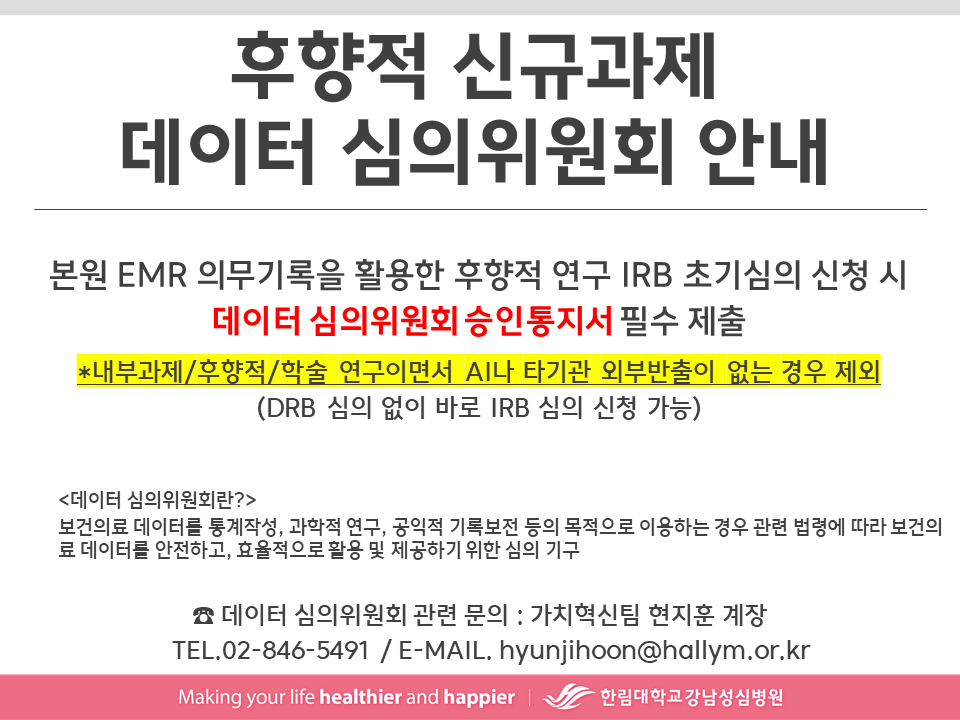 IRB 로그인 회원가입 IRB소개위원회 소개담당자 연락처심의안내심의절차심의종류심의일정심의일정표심의신청제출 서류보고별 서류심의비다운로드IRB서식계산서 발급기타계약종료문서 보관공지사항공지사항 IRB INTRODUCTION 한림대학교강남성심병원 임상시험연구윤리위원회(Hallym University Kangnam Sacred Heart Hospital Institution Review Board)는 인간대상연구 및 인체유래물연구 계획의 과학적, 윤리적 타당성을 심의하고, 연구에 참여하는 대상자의 권리, 안전, 복지를 보호하고자 병원 내에서 독립적으로 운영되고 있는 심의기구입니다. 업무별 담당자 업무별 담당자 정보를안내해 드립니다. 바로가기 IRB 소식 공지 심의/행사 2026년도 심의일정 안내 모니터링룸 예약 안내 (update 2025.07.11) 후향적연구 심의 신청 시 데이터심의위원회 심의 통지서 제출 안내 (update 2025.11.04) 문서보관료 인상 안내 (2025.03.01 이후 접수 과제부터 적용) 2025년도 심의일정 안내 2025년 12월 신속심의 (2차) 2025년 12월 정규심의 **12월 셋째주 정규심의 진행 2025년 12월 신속심의 (1차) 2025년 11월 정규심의 2025년 11월 신속심의 (2차) 일정안내 2023년 2024년 2025년 2026년 1월 2월 3월 4월 5월 6월 7월 8월 9월 10월 11월 12월 심의 행사 심의/행사 한림대학교 강남성심병원 연구대상자 보호를 위해 최선을 다하는 IRB Institutional Review Board 전화 › 070-4124-0820 : 정규심의, 신속심의, 모니터링, 문서보관 등› 070-4124-0833 : 계약 관련› 02-2069-5557 : 연구비 관련 (산학협력단) 팩스 › 02-846-9789 이메일 › hksirb@naver.com R-BAY 공지 바로가기 OpenPDF 라이브러리 사용 안내 [필독] 중요 업데이트 안내 (답변보고) R-BAY 시스템 [정기/비정기/긴급] 작업 안내(수정 및 정기작업추가) R-BAY 교육 바로가기 로그인 후 조회가 가능합니다.
