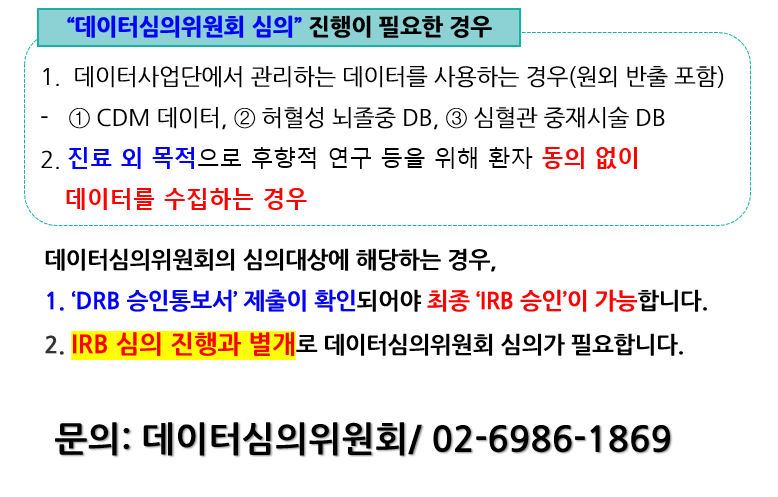 IRB 로그인 회원가입 IRB INTRODUCTION 이대서울병원 기관생명윤리위원회(IRB)는 헬싱키 선언에 근거한 윤리규정 및 임상시험관리기준(GCP), 국제임상시험통일안(ICH-GCP), 생명윤리 및 안전에 관한 법률 등 관련 규정을 준수하며, 임상시험계획서를 윤리적, 과학적 측면에서 심의함으로써 시험대상자의 권리·안전·복지를 보호하기 위해 독립적으로 설치된 기관위원회이다. 업무별 담당자 안내 IRB 소식 공지 심의/행사 [심의] 시정/보완보고 심의 제출안내 [심의] 인체유래물 제공/폐기/이관 심의 & 개인정보 제3자 제공 심의 신청 안내 [심의] 심의면제 신청안내 [심의] 신규과제 심의 신청안내 [심의] 결과보고 심의 안내 (2025.04.17 update) 2026년 신규과제 정식심의 일정 안내(12/22 화) 2026년 신규과제 정식심의 일정 안내(12/10 목) 2026년 신규과제 정식심의 일정 안내(11/24 화) 2026년 신규과제 정식심의 일정 안내(11/12 목) 2026년 신규과제 정식심의 일정 안내(10/27 화) 일정안내 2023년 2024년 2025년 2026년 2027년 1월 2월 3월 4월 5월 6월 7월 8월 9월 10월 11월 12월 심의 행사 심의/행사 전화 IRB신규과제, 심의비 : 02-6986-2607 신규외(변경, 중간, 종료/결과, 문제):02-6986-2608 HRPC (교육 ): 02-6986-2604CTC (계약,연구비,문서보관,모니터링):02-6986-2630 팩스 02-6986-2609 이메일 [IRB] irbseoul@eumc.ac.kr [HRPC] (교육 문의) hrpp@eumc.ac.kr R-BAY 공지 바로가기 R-BAY 시스템 [정기/비정기/긴급] 작업 안내(수정 및 정기작업추가) R-BAY 시스템 신규 사용자 이용 안내 서비스 가입 및 문의 R-BAY(e-IRB) 영문 번역 서비스 12/23(화) 오픈 안내 [필독] 중요 업데이트 안내 (답변보고) R-BAY 교육 바로가기 로그인 후 조회가 가능합니다.