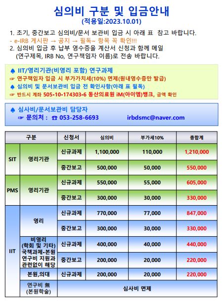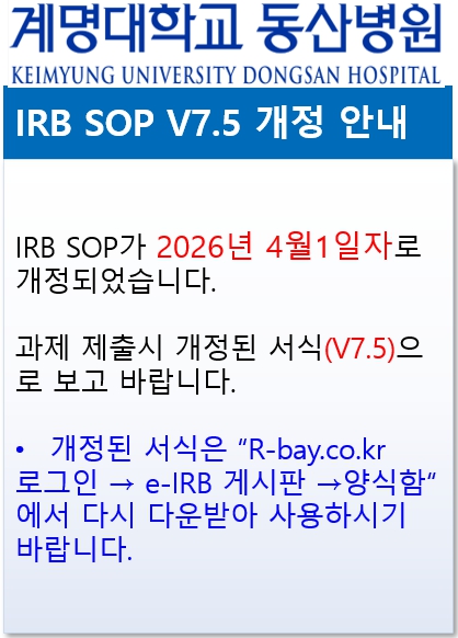 IRB 로그인 회원가입 IRB소개About IRBIRB 연혁IRB위원명단오시는 길심의안내심의보고기한제출서류안내심의료안내담당자임상시험센터IRB 연락처헬프데스크헬프데스크연구불만접수 IRB INTRODUCTION 위원회는 헬싱키 선언에 명시된 모든 종류의 연구대상자(피험자) 연구와 관련된 윤리원칙을 준수한다. 연구대상자(피험자) 동의, 위험-이익 평가 및 연구대상자 선정 등 모든 연구활동을 심의하는 데에 있어 헬싱키 선언의 윤리 지침을 바탕으로 한다. 임상연구는 헬싱키 선언에 근거한 윤리 지침, 기타 국제적 지침, 국내의 지침 및 규정에 따라 수행되어야 한다. 업무별 담당자 안내 IRB 소식 공지 심의/행사 IRB SOP(V 7.4) 개정 안내 드립니다. [시행일: 2025년 7월 1일] 2026년 정규심의 일정 안내(접수건수 등에 따라 조기마감) 동의서 인증 절차 변경 안내-동의서PDF파일 첨부필수 !필독!심의비&문서보관비 안내(부가세 별도) 문서이관 및 종사자 교육이수 안내 2026.04.01(수) 정규심의 안내(C패널) 2026.06.04(목) 신속심의 안내 2026.05.28(목) 신속심의 안내 2026.05.21(목) 신속심의 안내 2026.05.14(목) 신속심의 안내 일정안내 2023년 2024년 2025년 2026년 2027년 1월 2월 3월 4월 5월 6월 7월 8월 9월 10월 11월 12월 심의 행사 심의/행사 전화 *053-258-6691, 6694(심의/규정/QA)*053-258-6692(심의비 및 문서보관료)*053-258-6693(교육/문서이관) 팩스 이메일 irbdsmc@naver.com 임상연구보호센터/IRB R-BAY 공지 바로가기 R-BAY 시스템 [정기/비정기/긴급] 작업 안내(수정 및 정기작업추가) R-BAY 시스템 신규 사용자 이용 안내 서비스 가입 및 문의 R-BAY(e-IRB) 영문 번역 서비스 12/23(화) 오픈 안내 [필독] 중요 업데이트 안내 (답변보고) R-BAY 교육 바로가기 로그인 후 조회가 가능합니다.